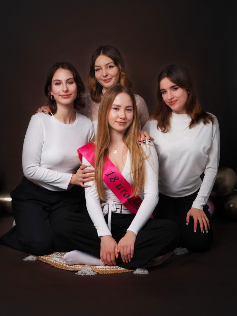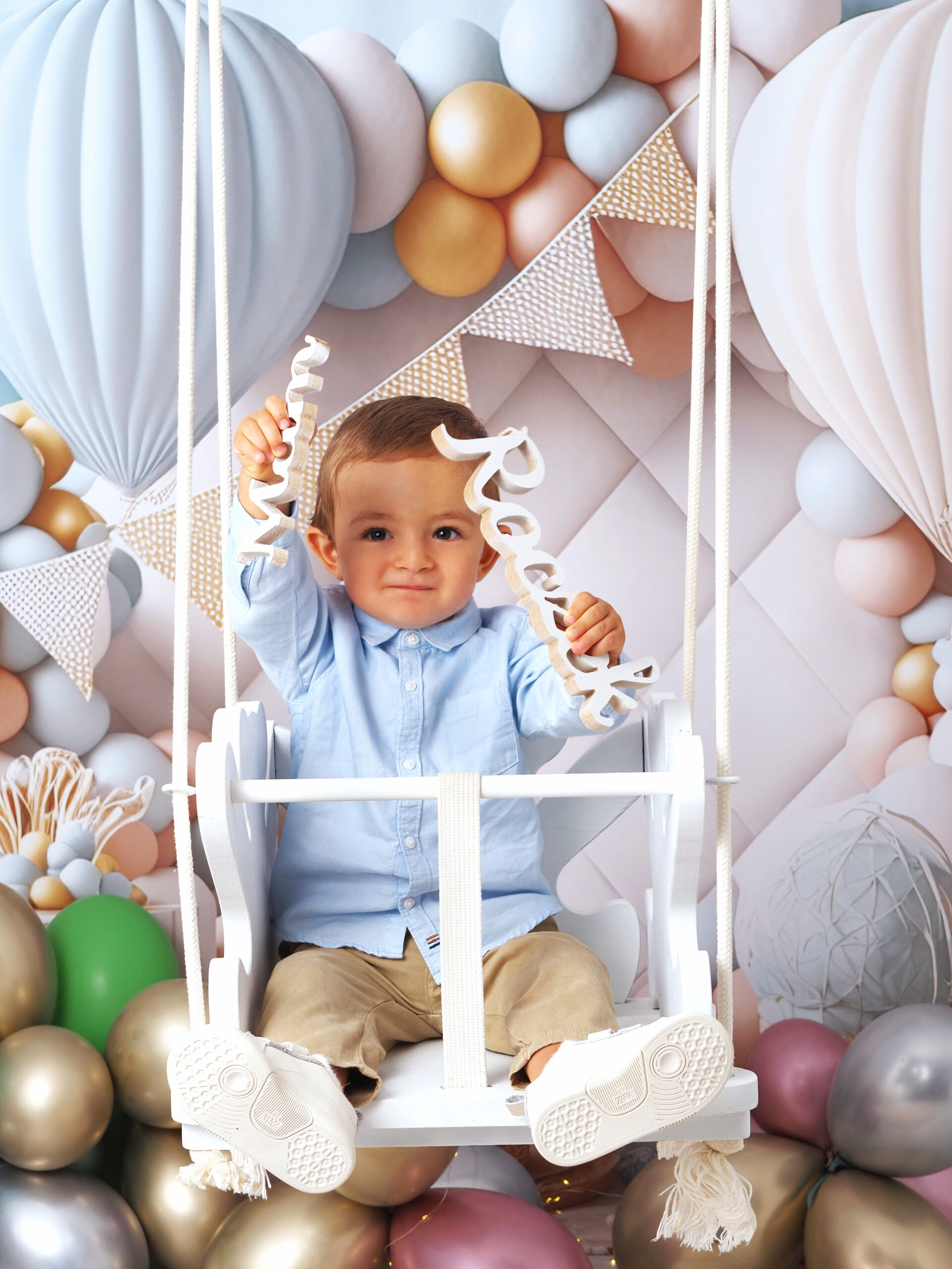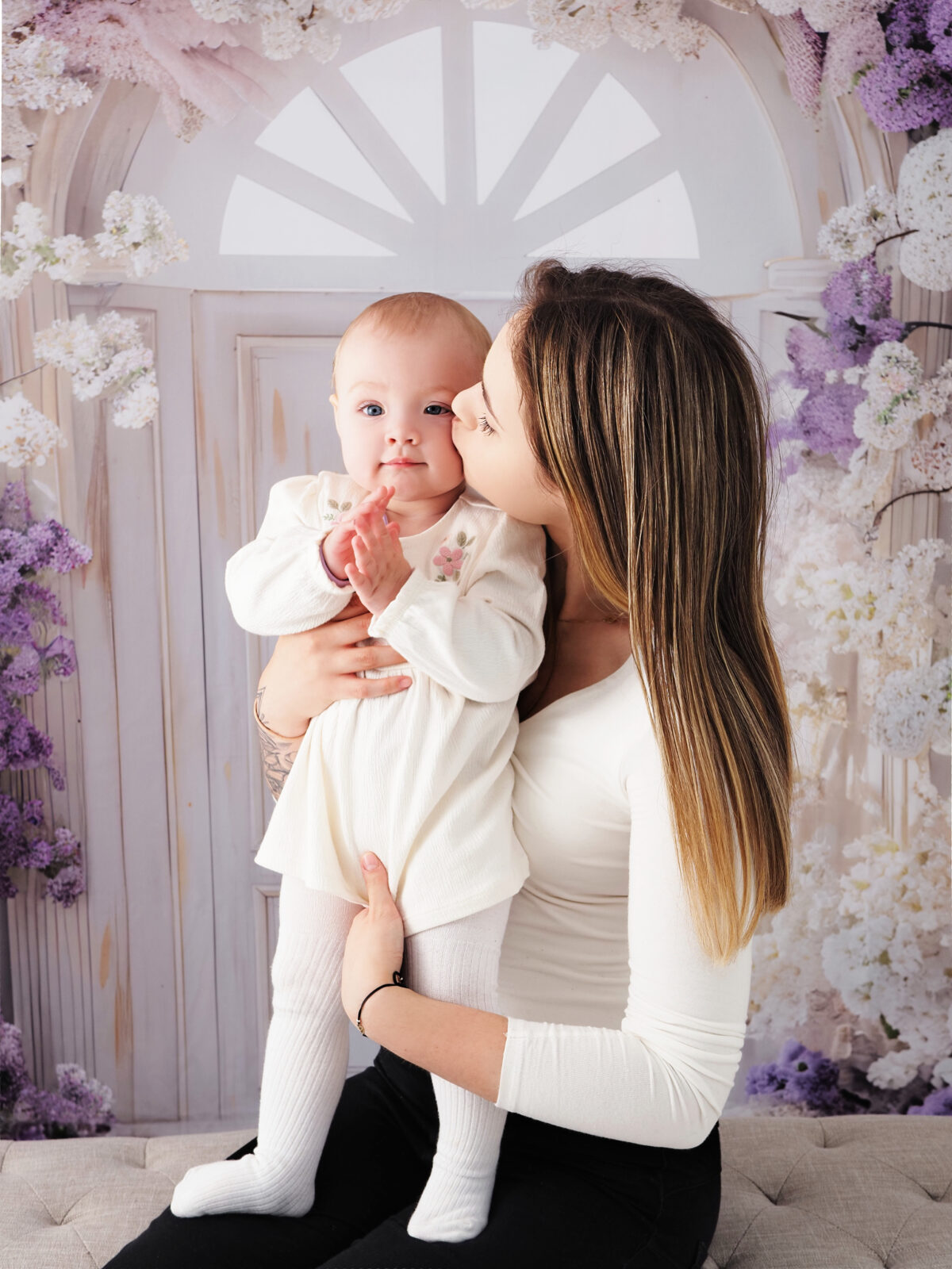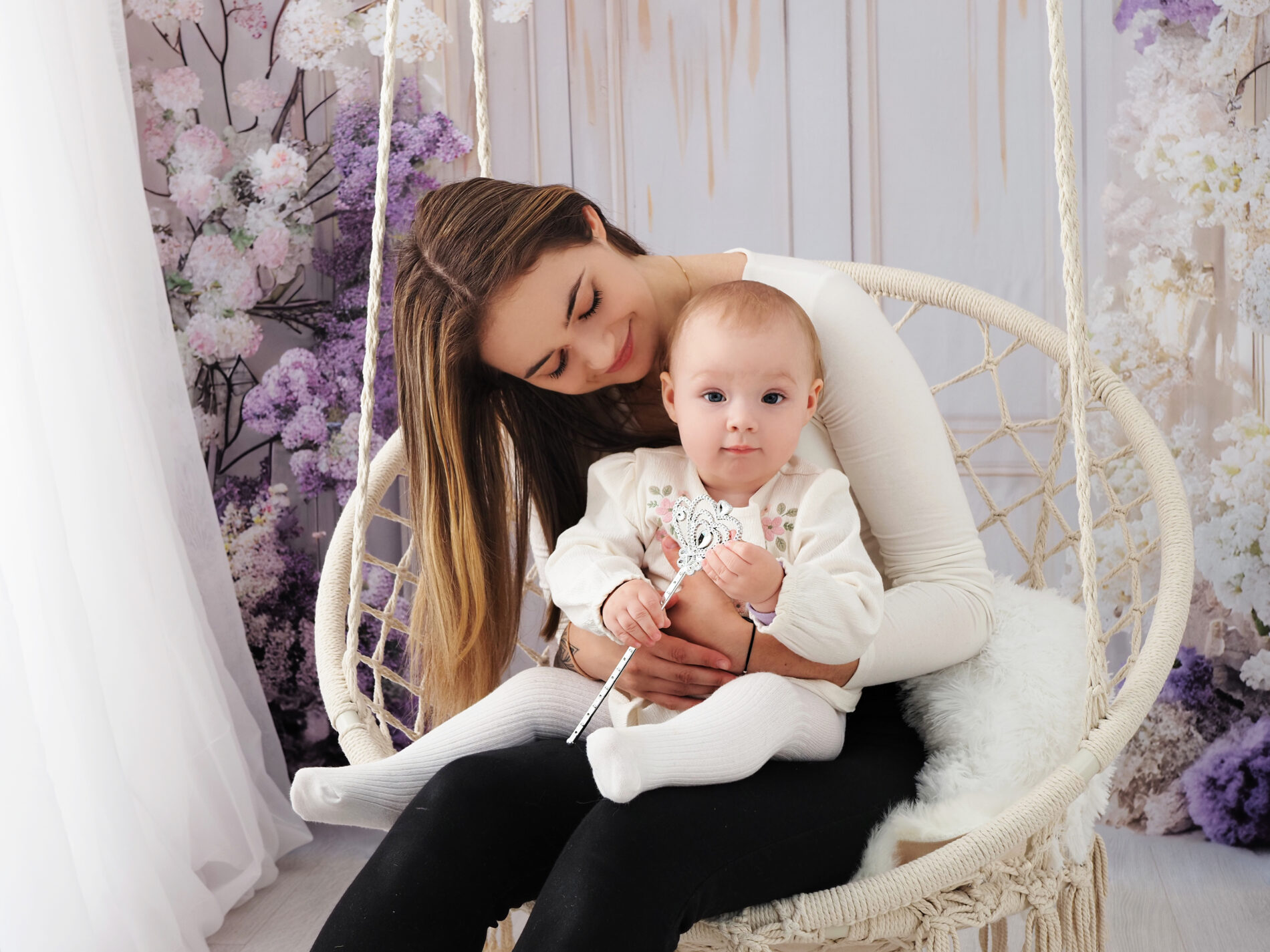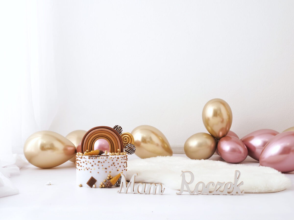 🟣 Trzecia aranżacja to sesje w bieli. Scenka jasna, delikatna, z dodatkami na roczek lub innymi, dostosowanymi do okazji i Twoich potrzeb.