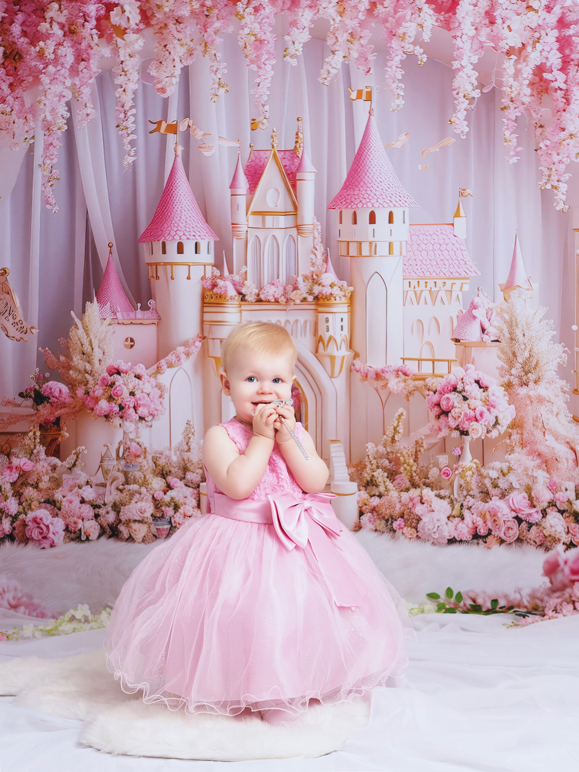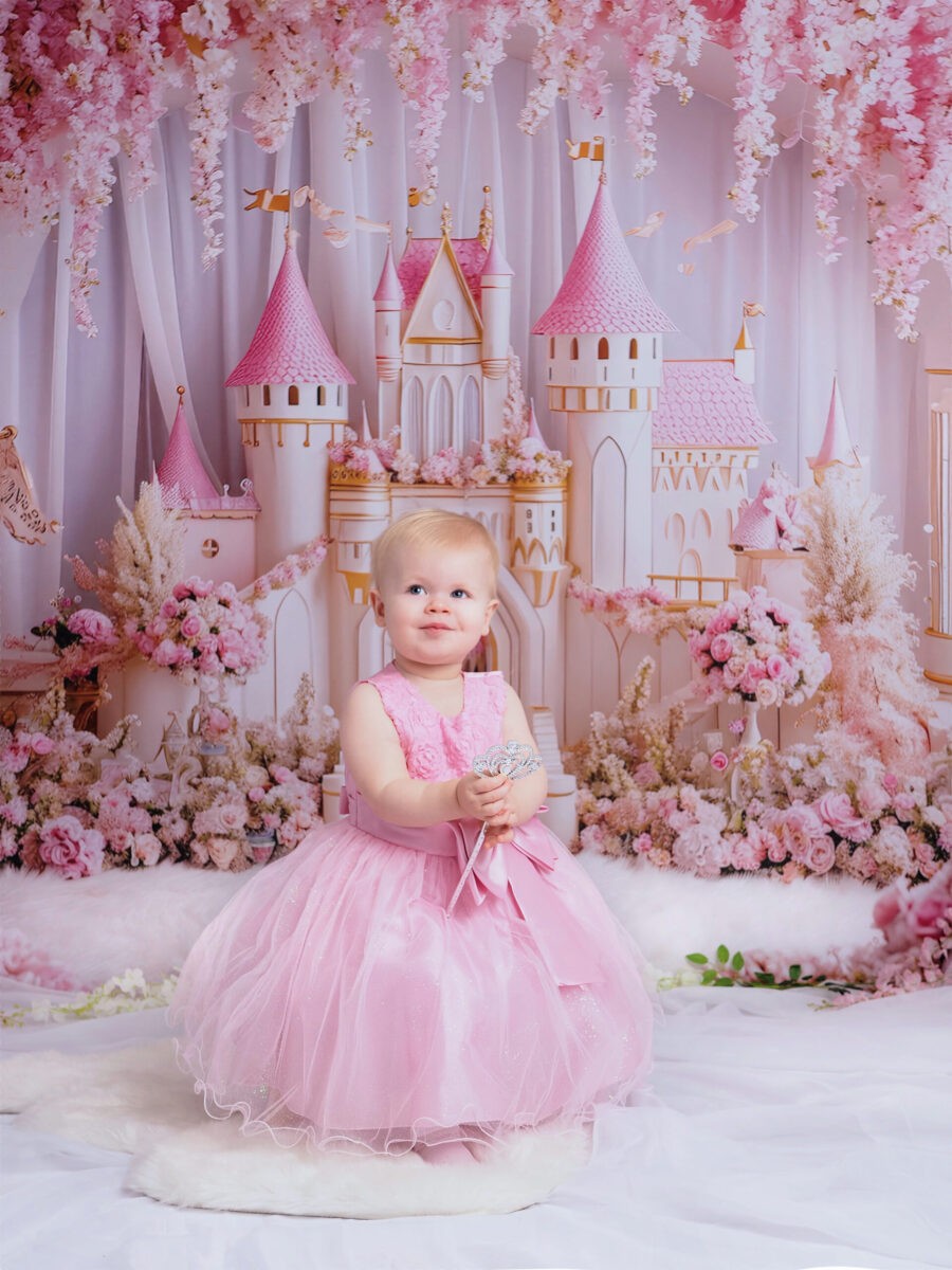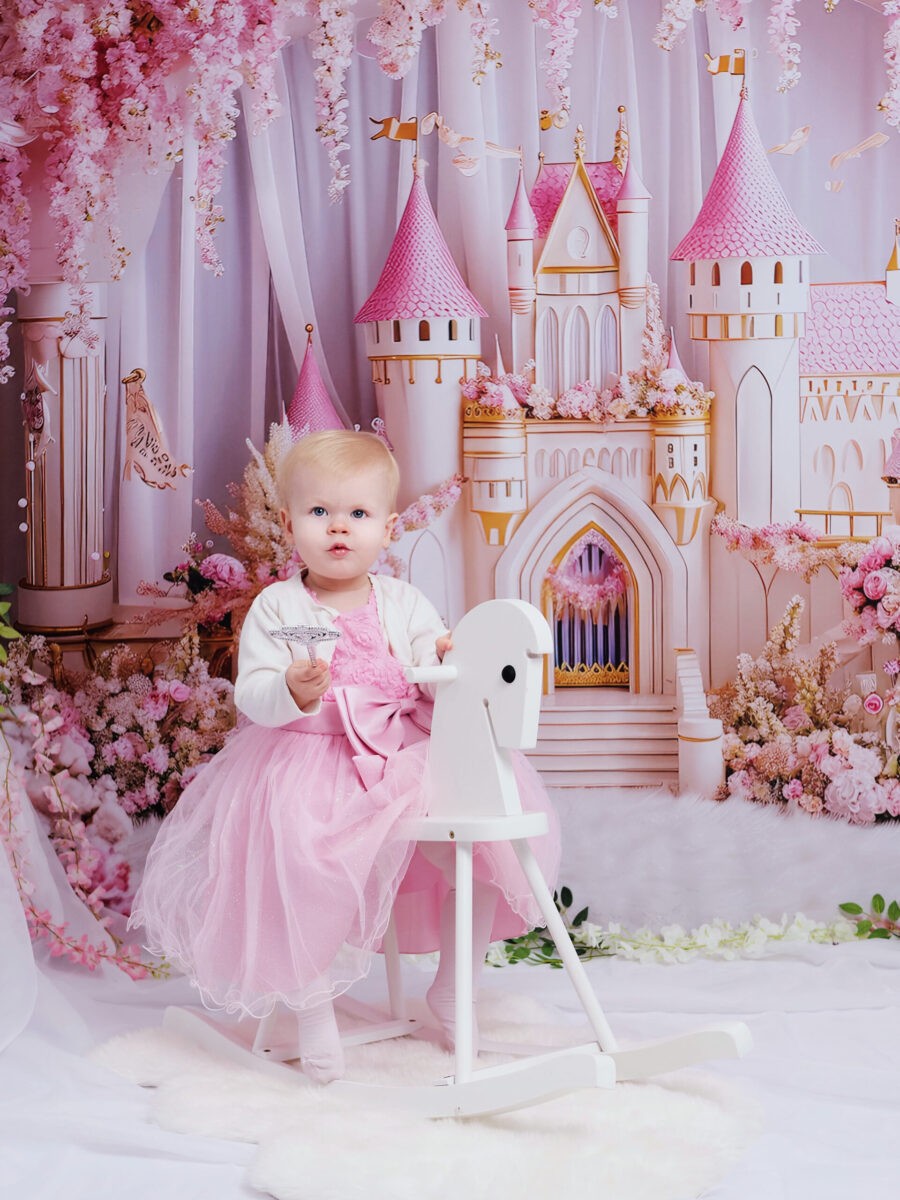 🟣 Druga aranżacja to scenka różowa. Dedykowana jest małym Księżniczkom. Róż, tiul, zamek królewny, korona i berło sprawią, że Twoja córeczka poczuje się jak w bajce.
